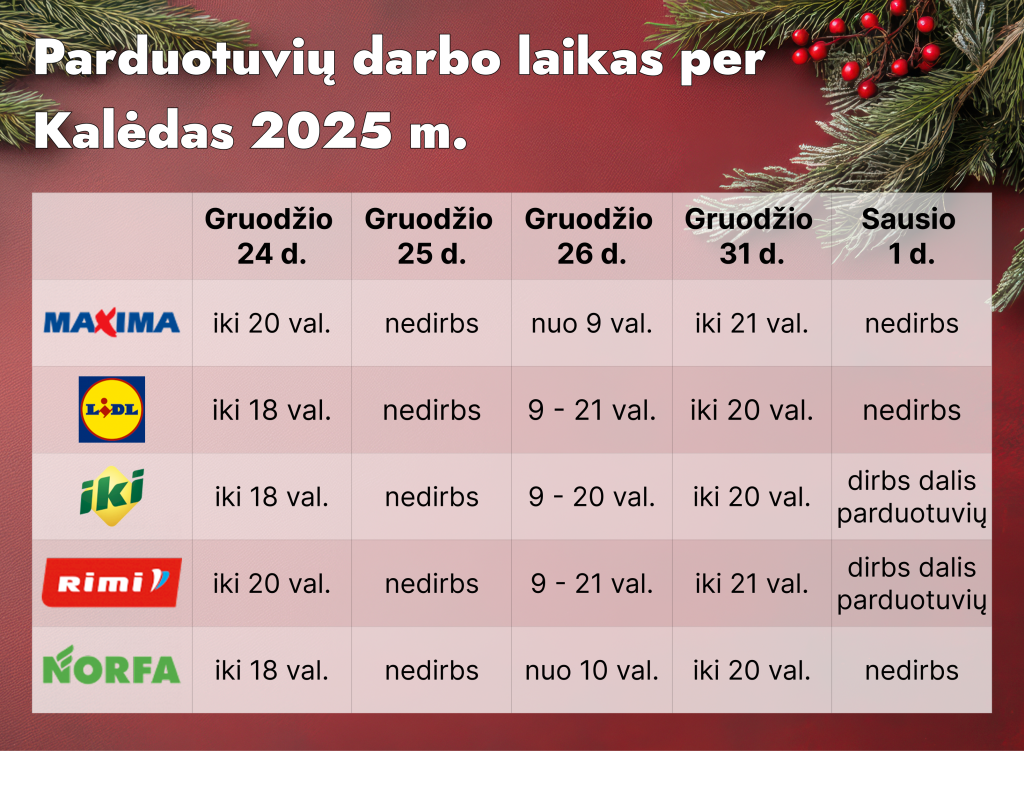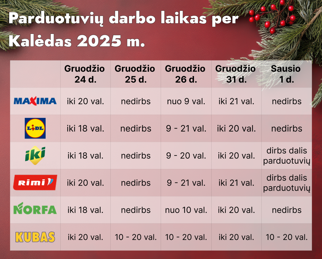 Parduotuvių darbo laikas per šventes 2025 m. Gruodžio 11, 2025