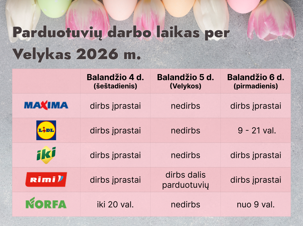 Parduotuvių darbo laikas per Velykas 2026 m. Kovo 30, 2026